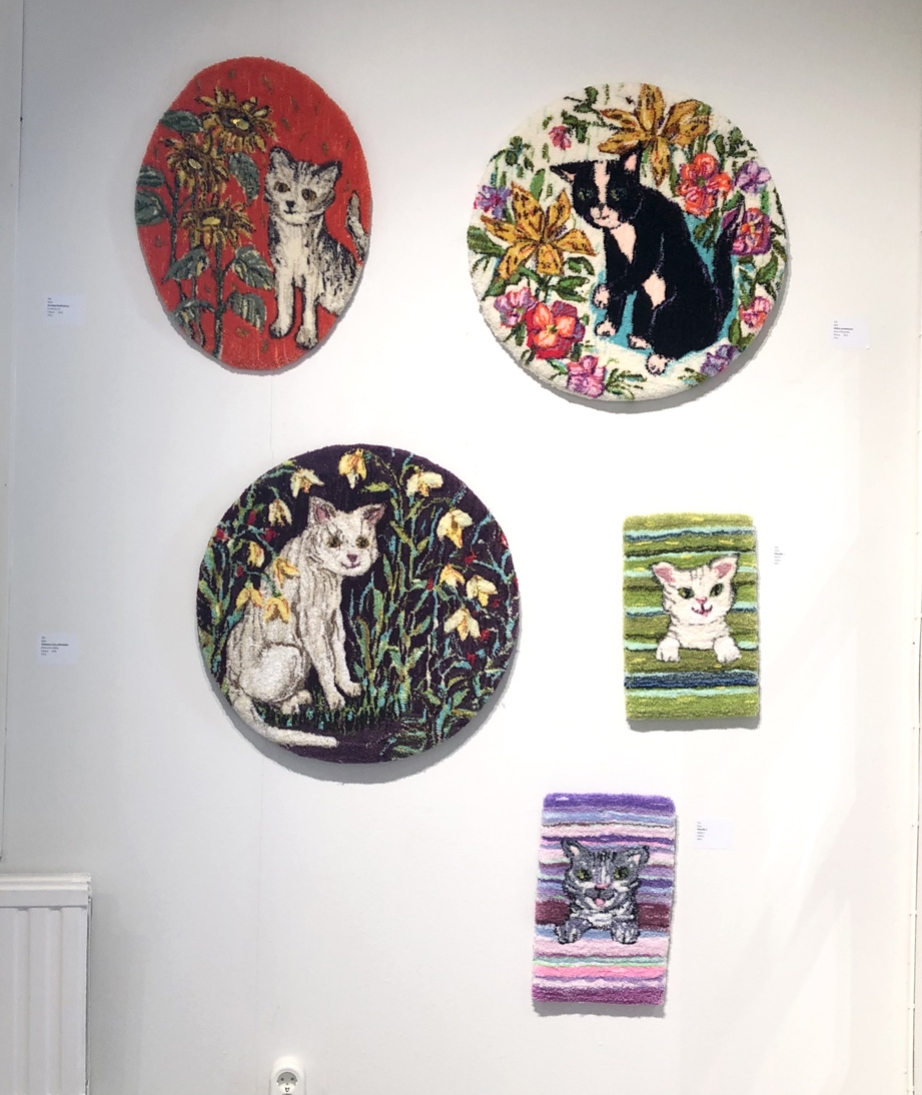 Minulta oli näyttelyssä kissa-aiheisia tuftauksia ja joitakin öljyvärimaalauksia.
